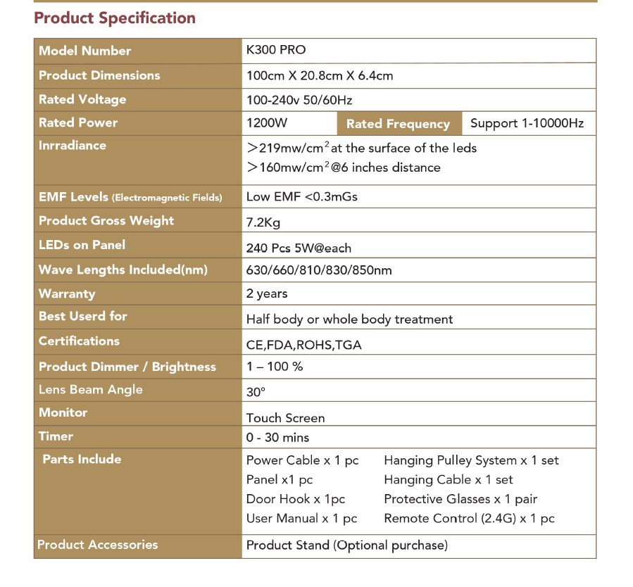 Available in two models, K100 PRO (compact, 300W) and K300 PRO (larger, 1200W), both models feature low EMF levels, multiple mounting options, and protective eyewear for safe and effective use.